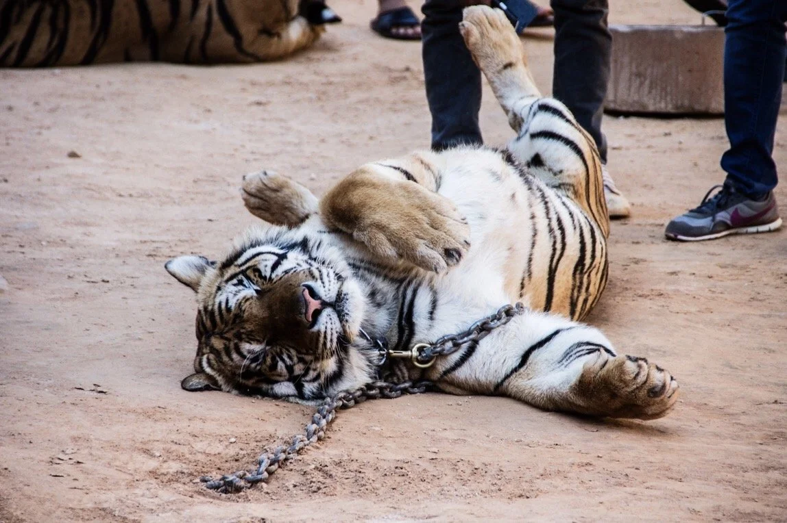 Something about watching the tiger cubs play in man-made pools, confined to the 8-metre radius they was allowed to move within while tied to a post, and straining against the leash, didn't seem right. The tigers lay on monks' laps in the afternoon sun, tails swishing slowly and barely responding to the excitable tourists (me) stroking them gingerly. Of course, we now know the truth about the Tiger Temple and how those who ran the place face no consequences. If you would like to read more about that, this article is a good start: http://.time.com/4470315/tiger-temple-thailand/